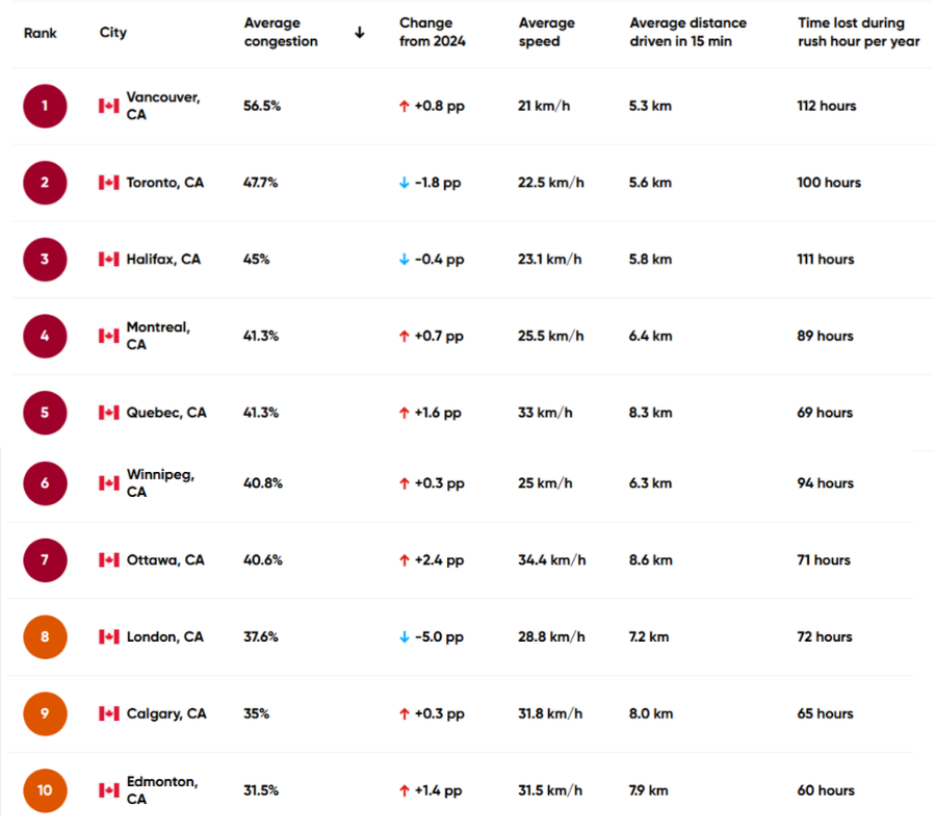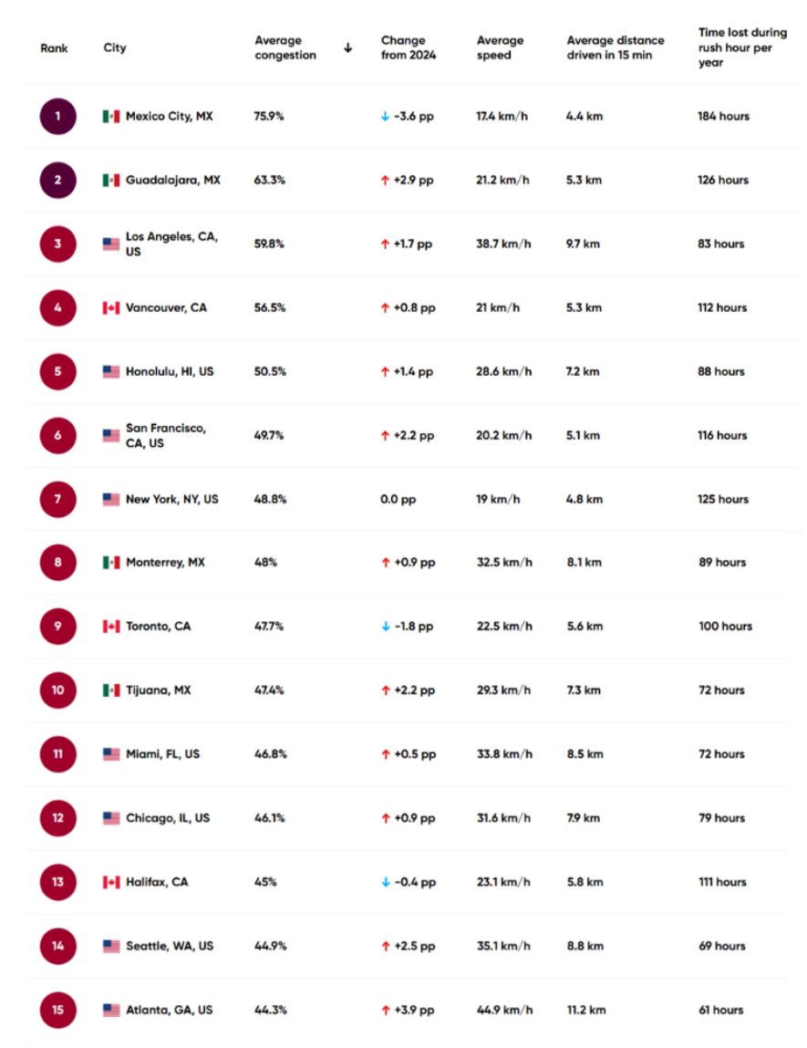 In the 2025 North American ranking, Canadian cities continued to feature prominently among the continent’s most congested urban areas, with several cities shifting position compared to 2024 as congestion dynamics evolved across the region: